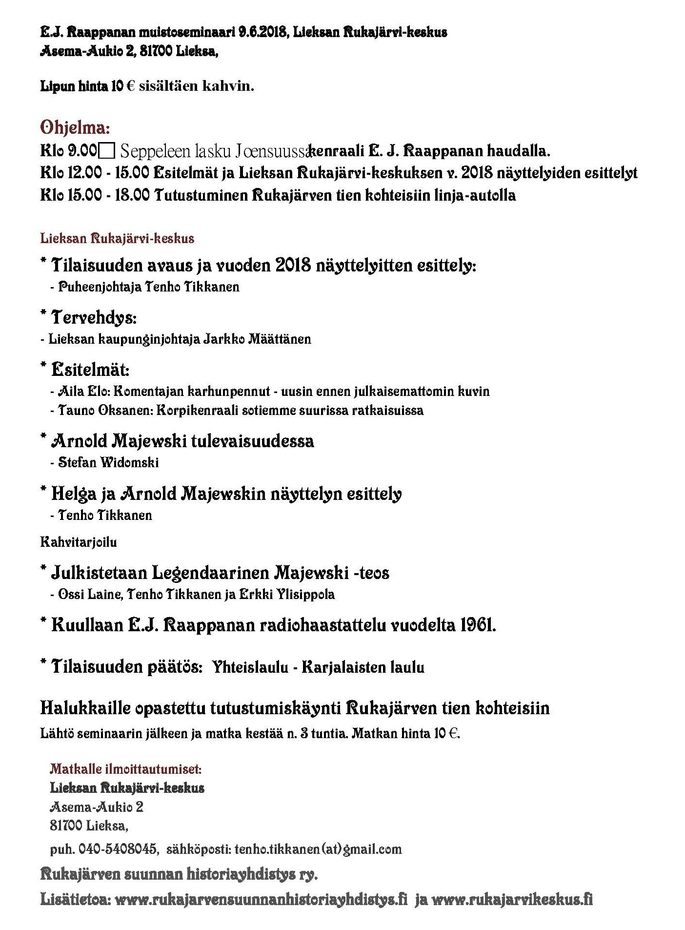 E.J. Raappanan muistoseminaari 9.6.2018, Lieksan Rukajärvi-keskus Asema-Aukio 2, 81700 Lieksa, 3.6.2018 RSHY E.J. Raappanan muistoseminaari 9.6.2018, Lieksan Rukajärvi-keskus