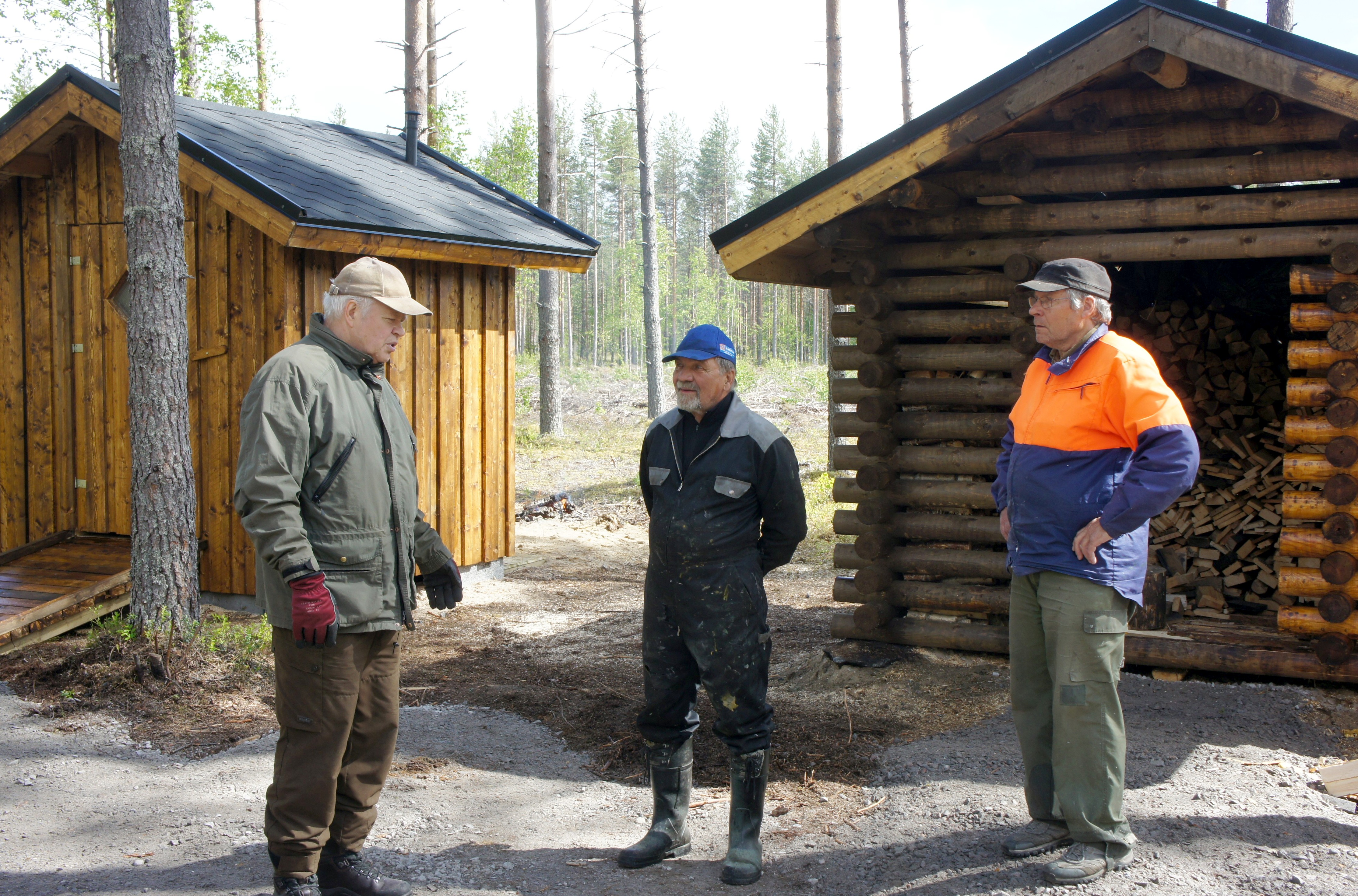 Talkoomihet, Mauri Mönkkönen, Heikki Turunen ja Raimo Saviranta. Erkki Turunen kävi tasoittamassa piha-alueet. Kuva Tenho Tikkanen.