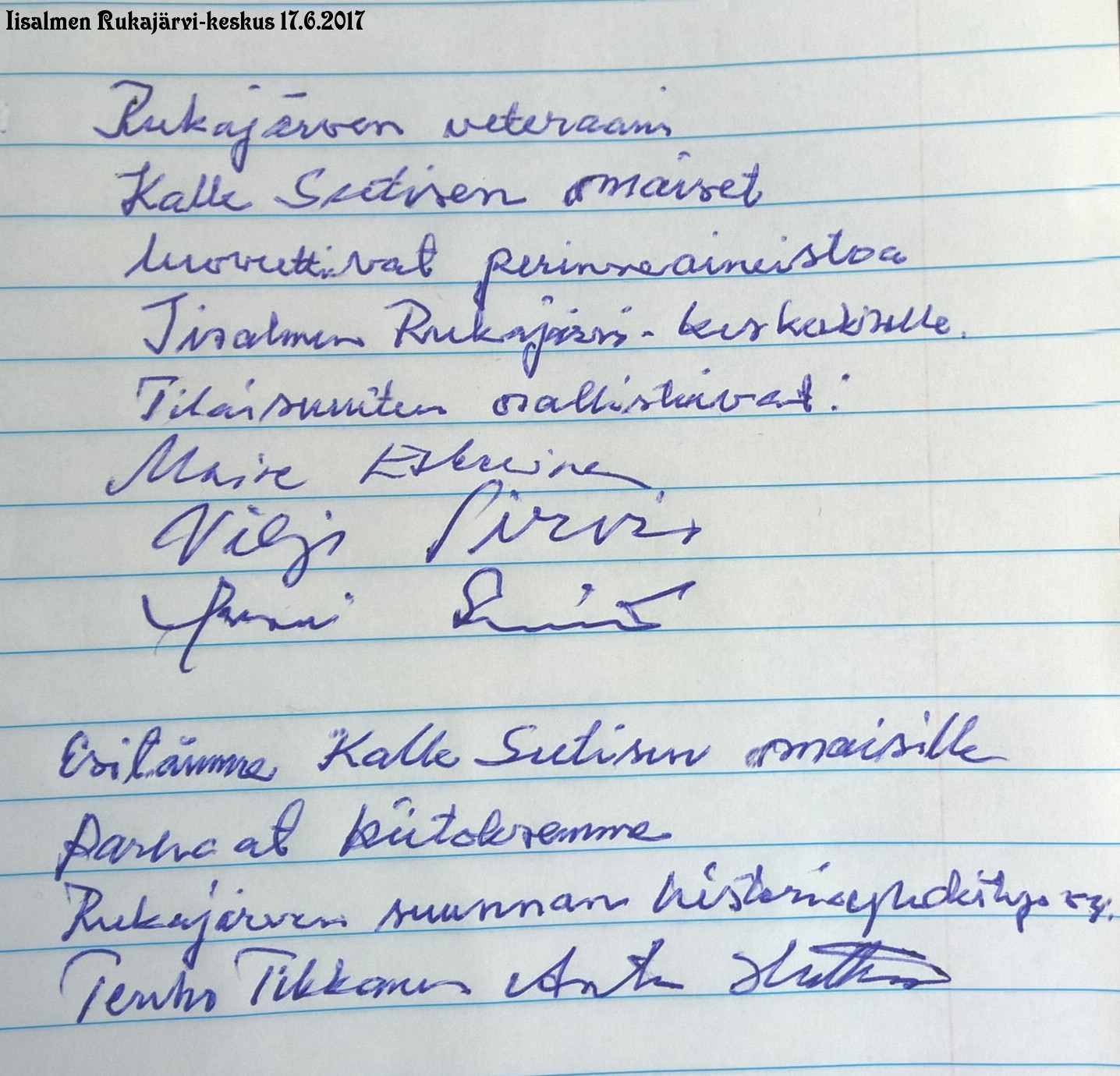 Kiittäessään Kalle Sutisen omaisia arvokkaasta lahjoituksesta Tikkanen viittasi Kalle Sutisen muistotilaisuudessa 20.5.2017 pitämäänsä puheeseen. Erityisen arvokkaaksi tämän lahjoituksen tekee se, että saamme lahjoituksen Rukajärven veteraanin omaisilta, veteraanin joka puolusti sodassa maataan ja sodan jälkeen arvokkaasti myös mielipiteitään.