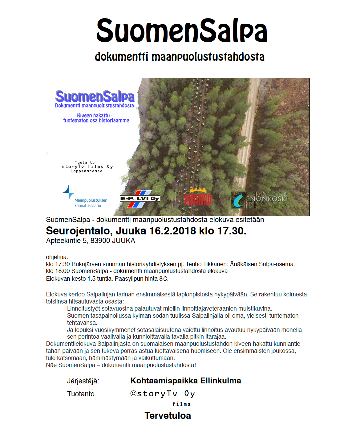 SuomenSalpa huippudokumentti – elokuva esitetään nyt Juukan Seurojentalolla 16.2.2018 alkaen klo 17.30. Os. Apteekintie 5, 83900 Juuka.