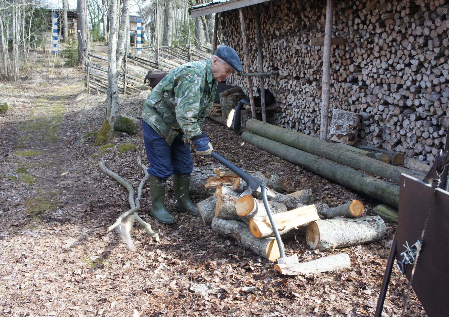Veteraani Tauno Tikkanen puita pilkkomassa Kiuruvedellä järjestetyissä mottitalkoissa.