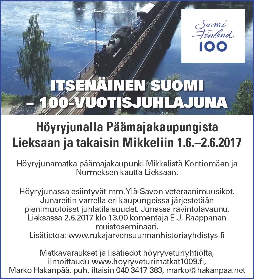 Nyt on korkea aika ilmoittautua Itsenäinen Suomi 100 – juhlajunaan – vielä ehtii 13.5.2017 Rukajärvi-keskus- RSHY ry Lisätietoa http://www.rukajarvensuunnanhistoriayhdistys.fi/historiayhdistys/tapahtumat/