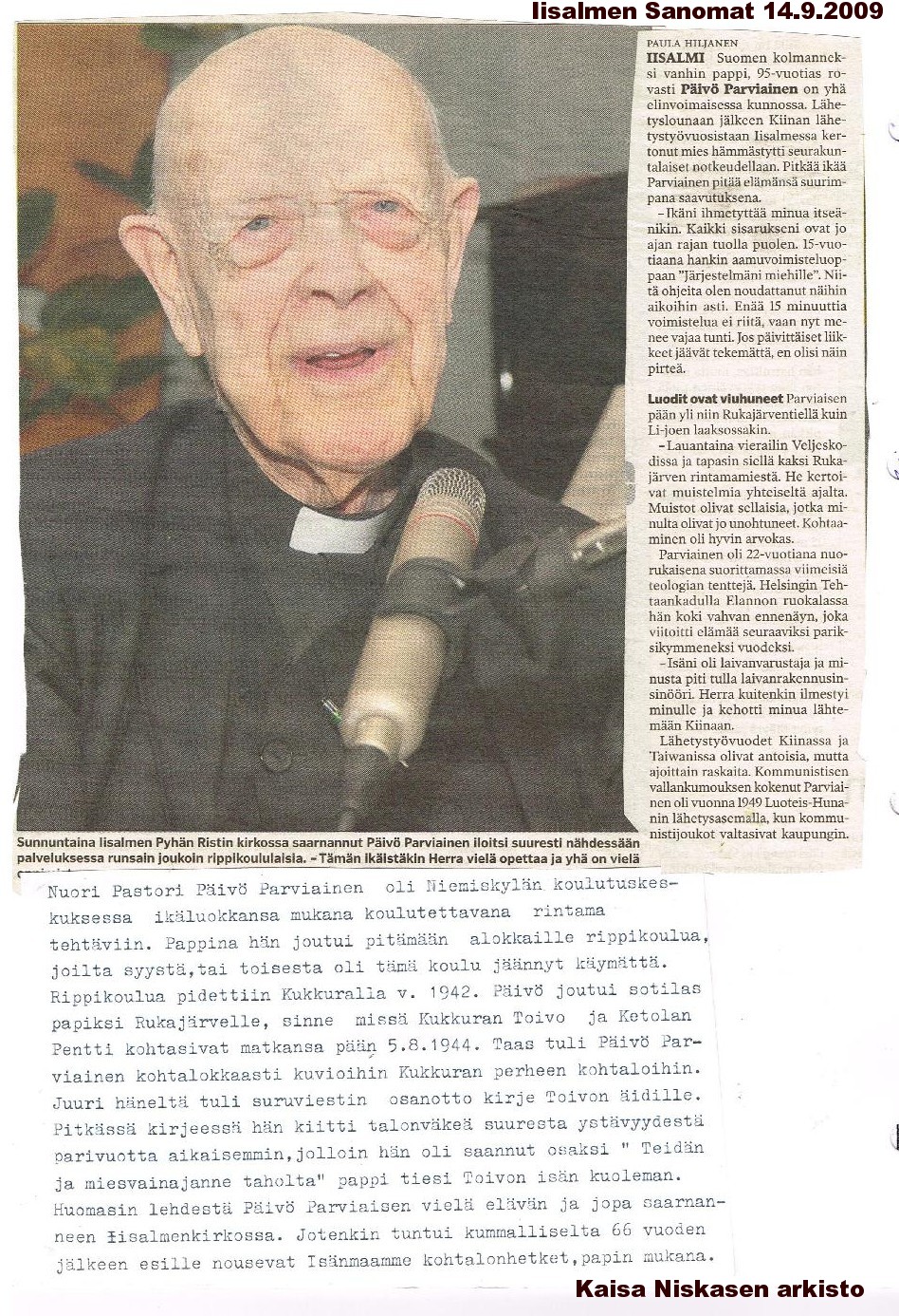 Rovasti Päivö Parviainen (19. 6. 1912– 19. 4. 2015) oli tunnettu henkilö monelta saralta. Hän oli suomalainen evankelis-luterilaisen kirkon pappi, lähetystyöntekijä ja Kiinan kulttuurin tuntija, joka viimeiseen asti käytti Luojan hänelle antamia puheenlahjoja.