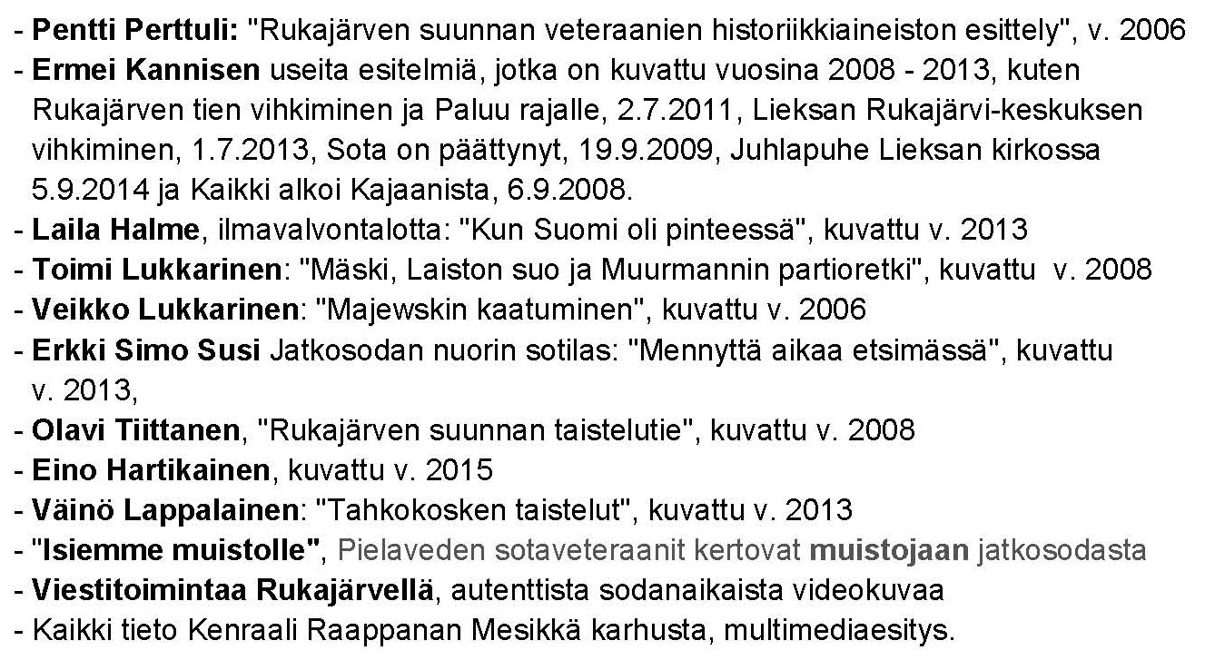 Viikonlopun 1. – 3.9.2017 aikana katsottavissa Lieksan Rukajärvi-keskuksessa mm. seuraavia veteraanien videohaastatteluja: