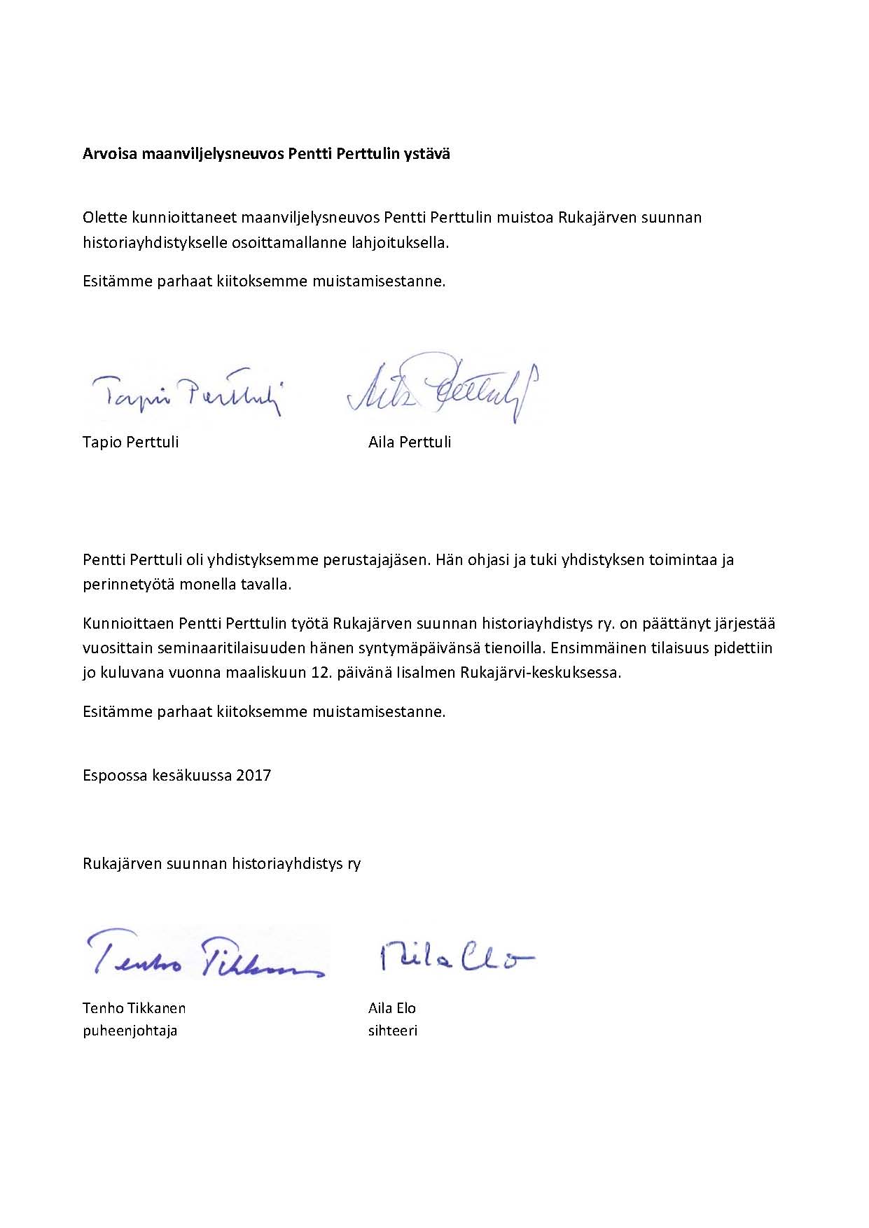 Pentti Perttulin lähiomaiset ja Rukajärven suunnan historiayhdistys yhdessä ovat lähettäneet edellä mainituille henkilöille ja yhteisöille kiitoskirjeen, joka on lähetetty Pentti Perttulin kuvalla varustetulla postimerkillä.