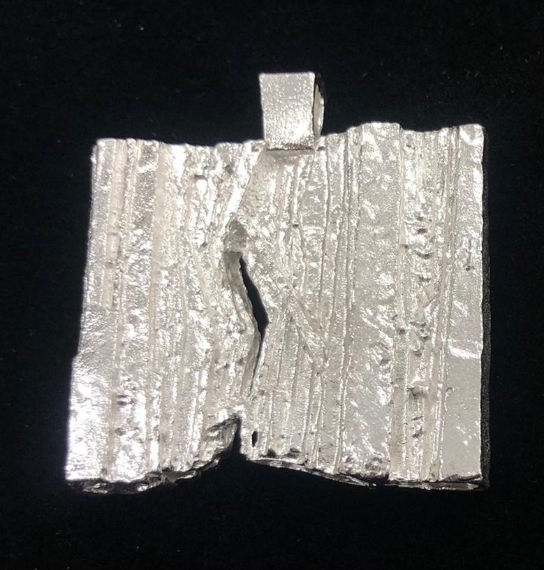 Hopeinen riipus, joka on jäljennös Lieksassa sijaitsevasta Rukajärven suunnan Jotos -muistomerkistä.