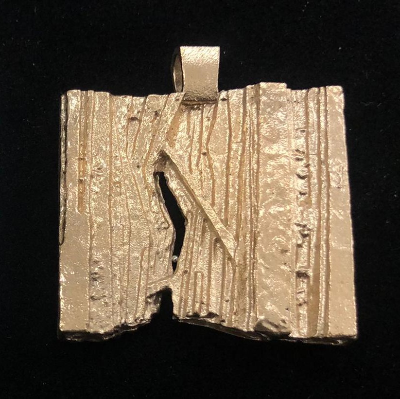 Kultainen riipus, joka on jäljennös Lieksassa sijaitsevasta Rukajärven suunnan Jotos -muistomerkistä.