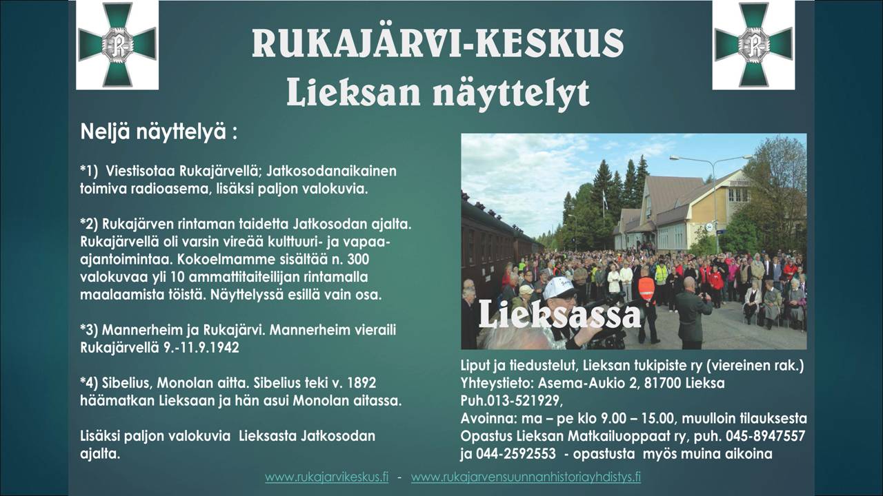 Lieksan Rukajärvi-keskuksessa oppaana 22.7. – 30.7. 2017 välisen ajan toimii Rukajärven suunnan historiayhdistys ry:n puheenjohtaja Tenho Tikkanen. (Ilmainen opastus alkaa täysiltä tunneilta.).