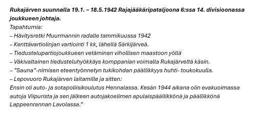 Keskiö- ja viestiupseerina Ryssänkarin linnakkeella 19.6.41 – 10.9.1941. Jv-koulutuskeskuksessa Inhassa 11.9 – 22.9.1941. Jv-koulutuskeskus 15:ssa 23.9. – 41-12.1.1942 Limingassa ja Oulussa. Rajajääkäripataljoona 6:ssa 14. Divisioonassa 19.1. – 7.5.1942 Rukajärven suunnalla, mm. Muurmannin radan retkellä. Taas Jv-koulutuskeskuksessa Oulussa 8.5.42 – 1.3.1943 ja Jv-koulutuskeskus 12:ssa Rissalassa 2.3. – 3.5.1943. Sitten PM:n Huolto 3:n alaisessa erillisessä liikennejoukkueessa 4.5.43 – 17.11.1944. Päätyö kenraali Airon antamin valtuuksin valvoa liikennettä eri puolilla, mm. Äänislinnan, Rukajärven ja Suomussalmen suunnilla.