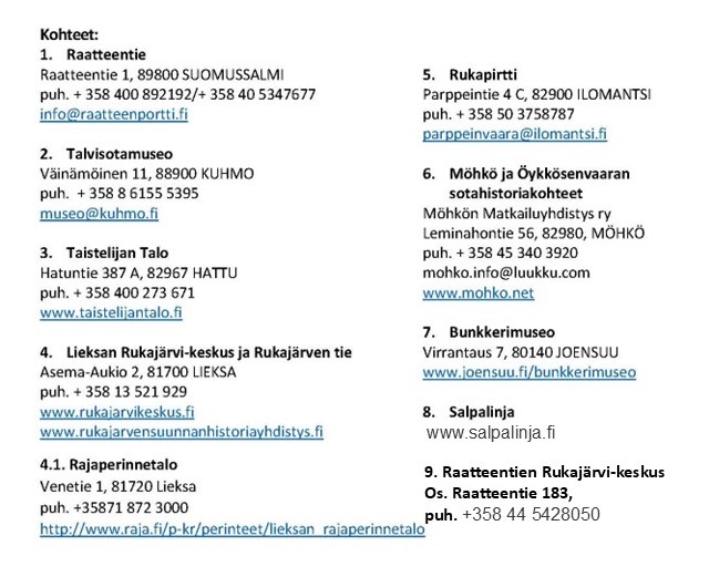 Lisäksi toivomme, että välittäisitte tietoa arvokkaista kohteistamme. Meidän kohteissamme on asiantuntevat oppaat, Lieksan Matkailuoppaat ry huolehtii Lieksan Rukajärvi-keskuksen opastuksesta ja Kiuruvedellä yhdistyksemme hallituksen jäsenet ovat tarvittaessa käytettävissä oppaan tehtäviin.