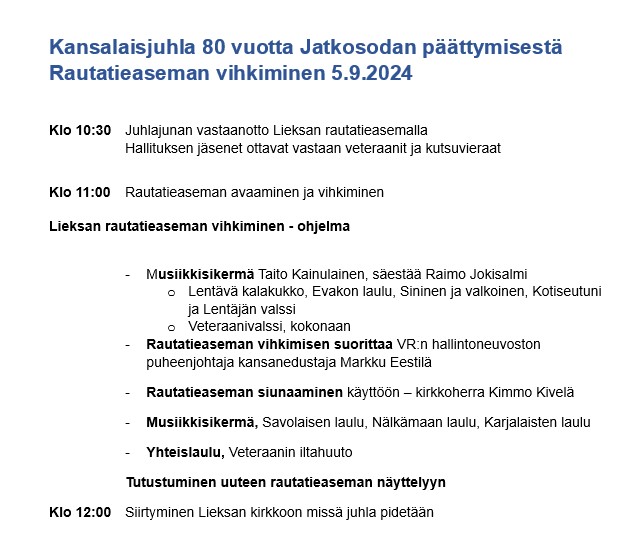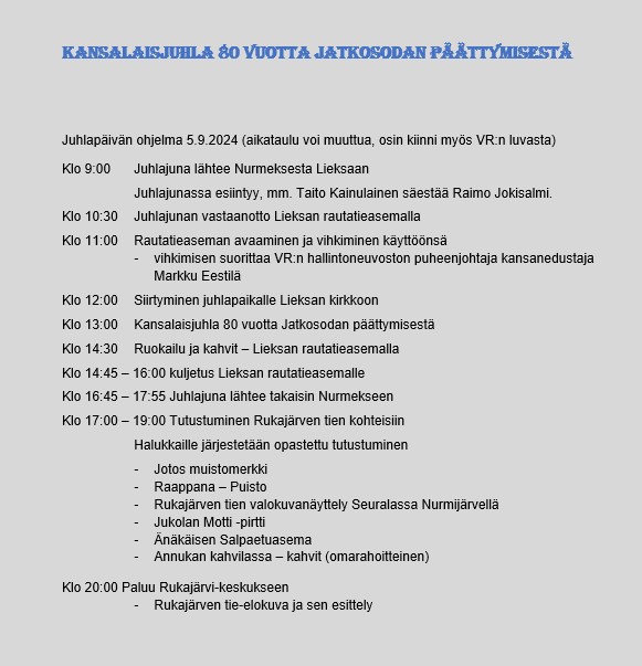 Tällä kertaa matkustamme höyryjunalla Nurmeksesta Lieksaan, jossa pidetään Kansalaisjuhla 80 vuotta Jatkosodan päättymisestä oheistapahtumineen.
