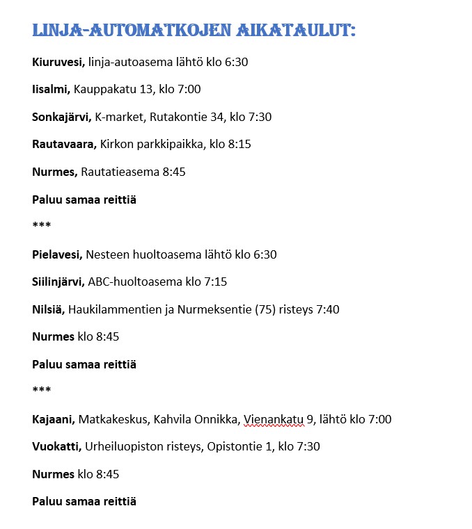 (Kajaanista lähtö joudutaan järjestämään henkilöautokuljetuksena samasta paikasta niiden osalta, jotka ovat varanneet matkan 3.9.2024 mennessä. Kuljettaja Ossi Laine puh. 0400-932403). Kiuruvedeltä ja Pielavedeltä lähtevät reitit ajetaan yllä ilmoitetun aikataulun mukaisesti.