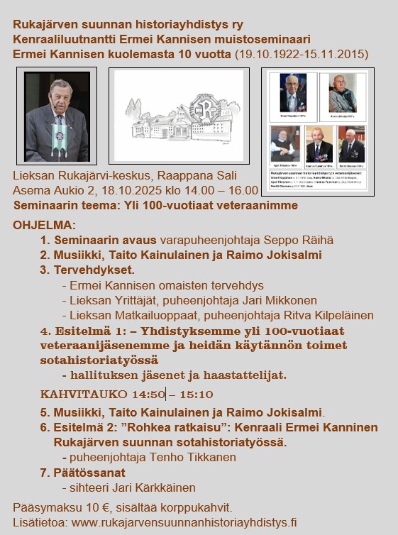 Lauantaina 18. lokakuuta kello neljätoista järjestetään perustajajäsenemme kenraaliluutnantti Ermei Kannisen muistoseminaari. Hänen poismenostaan tulee kuluneeksi tässä kuussa 10 vuotta.