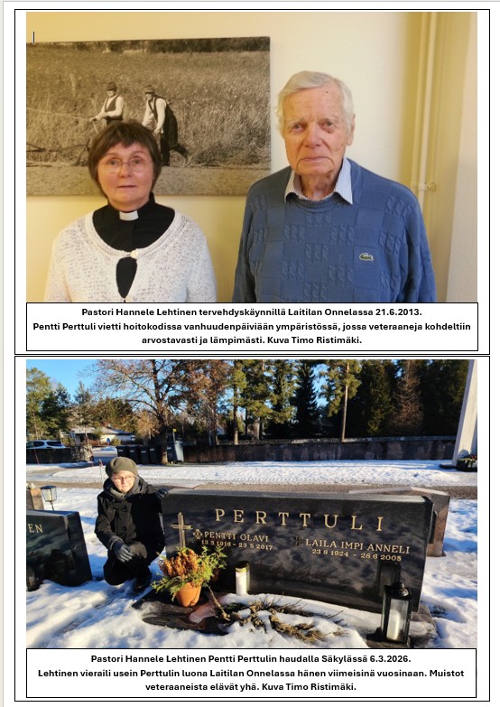 Maaliskuun 6. päivänä 2026 Hannele Lehtinen pysähtyi Pentti Perttulin haudalle sytyttämään kynttilän. Ele on osoitus hyvistä käytöstavoista, ele on pieni, mutta kertoo paljon siitä kunnioituksesta, jota veteraanin vuosien takainen kohtaaminen ja elämäntyö yhä herättää.