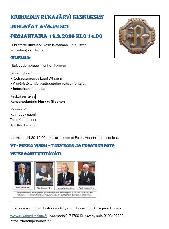 Kiuruveden Rukajärvi-keskus avattiin 13.3.2026 juhlavassa tilaisuudessa Talvisodan päättymisen muistopäivänä. Yli sata vierasta kokoontui kunnioittamaan veteraanien perintöä, kuulemaan juhlaesitelmän sekä todistamaan keskuksen paluuta tärkeäksi muistamisen ja historian tallentamisen paikaksi.