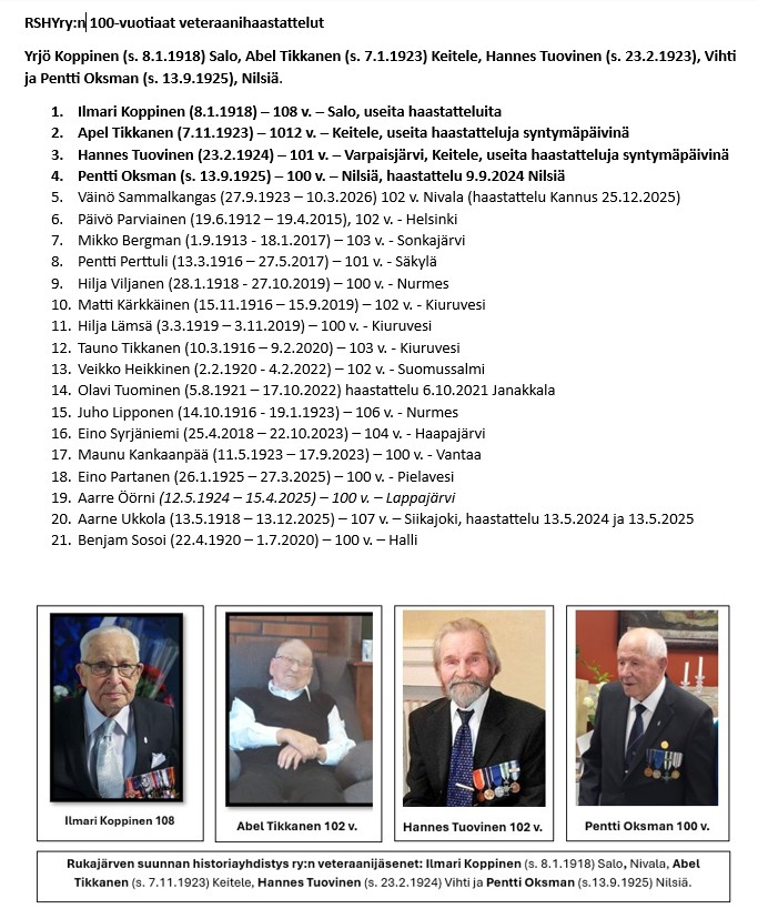 Väinö Sammalkangas on yksi sadoista Rukajärven suunnan historiayhdistyksen haastattelemista veteraaneista, joista peräti 21 on ylittänyt 100 vuoden rajan. Luettelo ohessa: