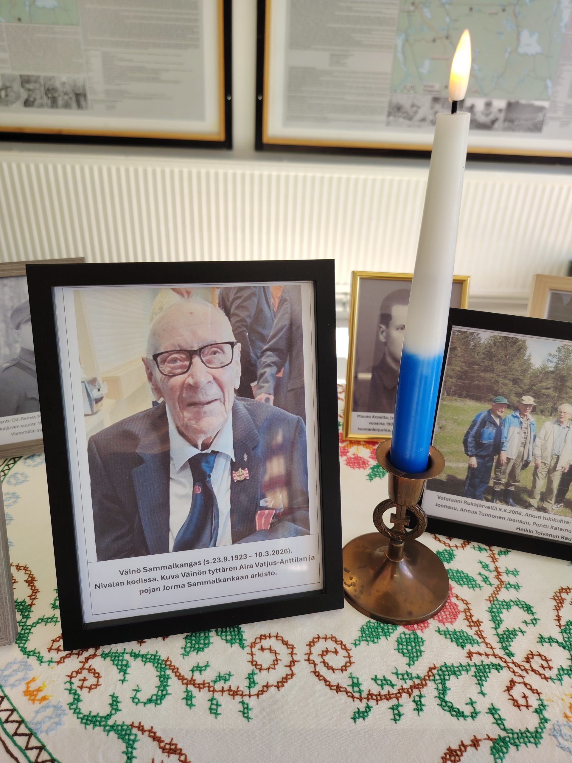 Kiuruveden ja Lieksan Rukajärvi-keskuksissa paloi hautajaisten kunniaksi veteraanin kuvan vierelle sytytetty sinivalkoinen kynttilä. Väinö Sammalkankaan kuva veteraanivljien kera. Kuva Kiia Pasanen.
