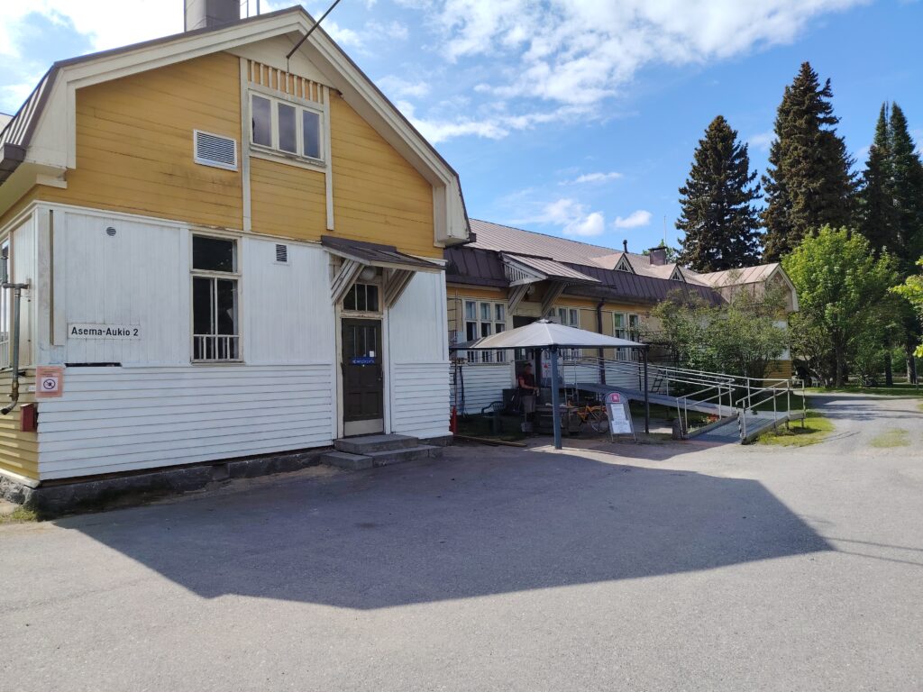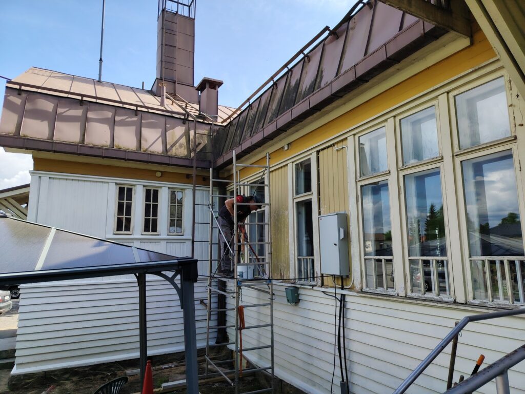 Lieksan rautatieasemalla työt jatkuvat ulkoseinien maalauksella. Kaiken tämän keskellä valmistellaan kesän vierailijoitten vastaanottoa – ja vieraita kyllä todella riittää.