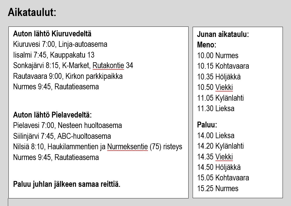• 1. reitti: Linja-automatka Kiuruvesi–Iisalmi–Sonkajärvi–Rautavaara–Nurmes