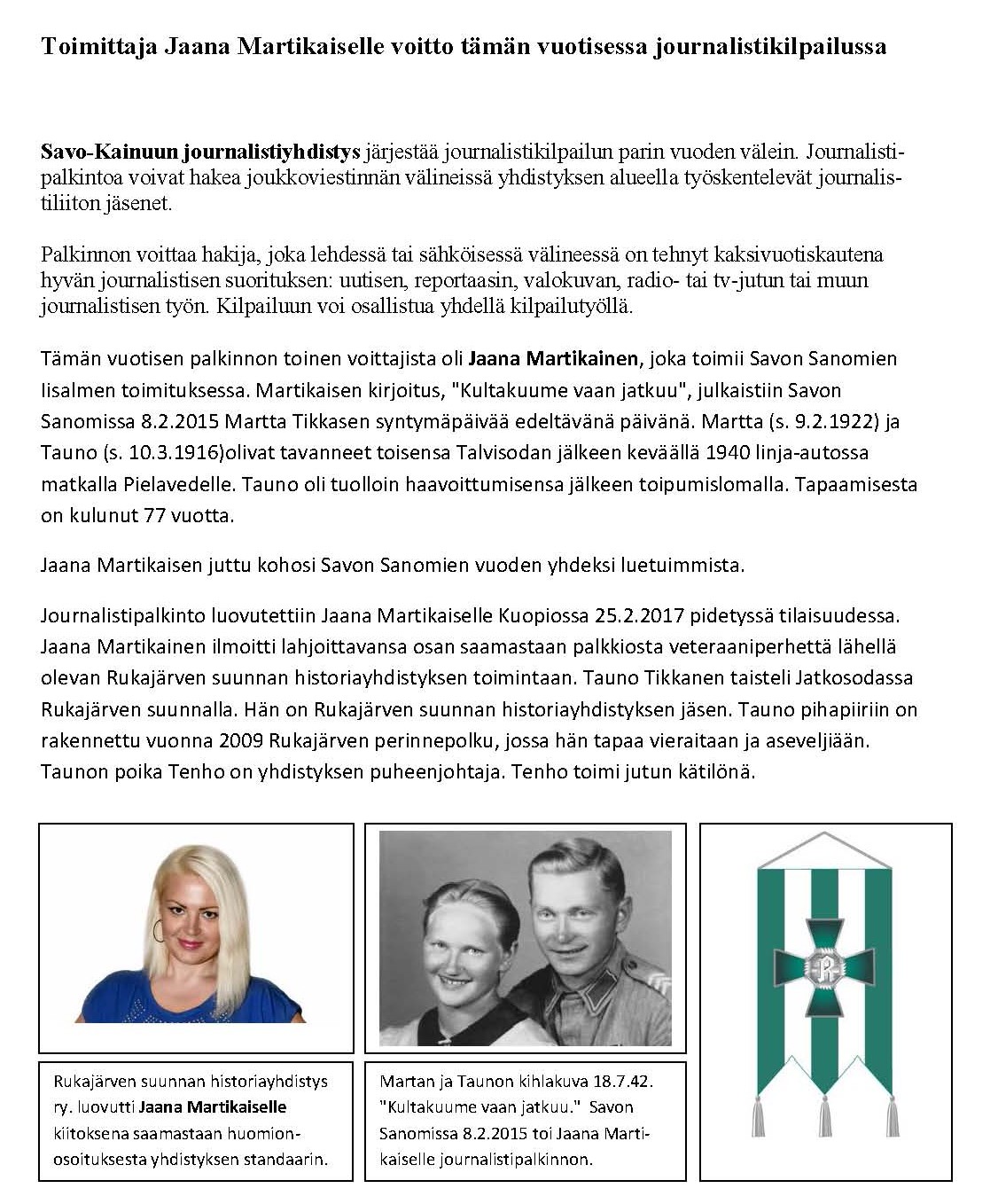 Toimittaja Jaana Martikaiselle voitto tämän vuotisessa journalistikilpailussa 25.2.2017 RSHY Jaana Martikaisen juttu on luettavissa TÄÄLTÄ ja nettissä julkaistun voi lukea TÄÄLTÄ. Savon Sanomissa journalistipalkintoa koskevan 25.2.2017 julkaistun uutisen voi lukea TÄÄLTÄ: