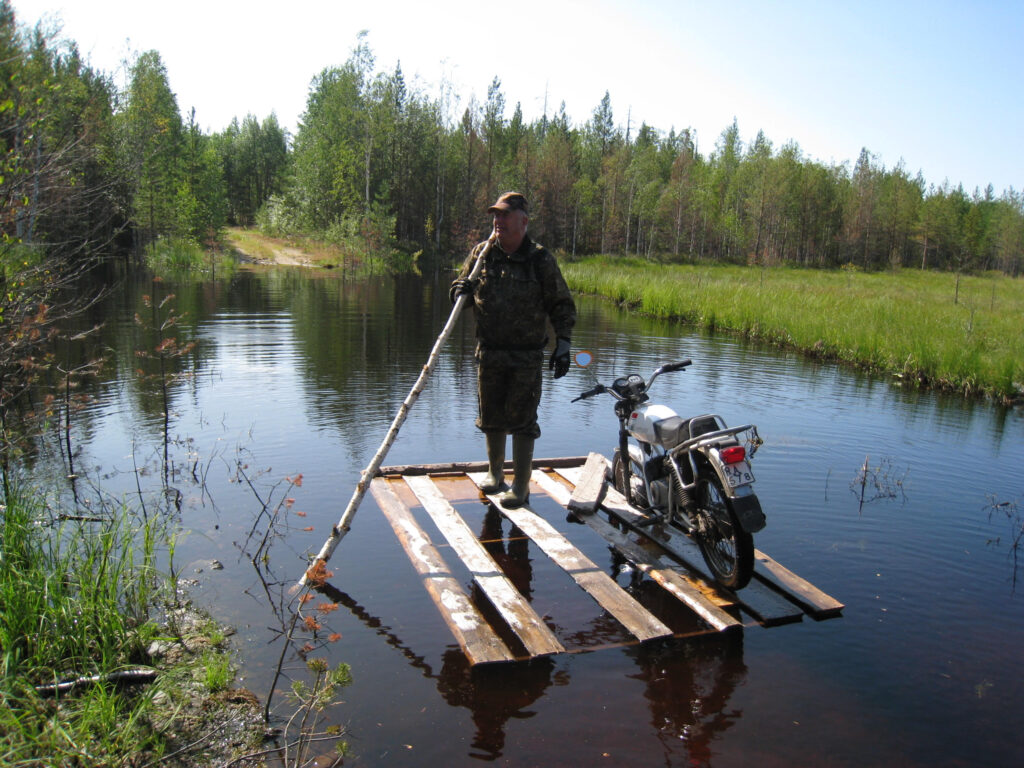 Majavat olivat tehneet padon. Siksipä tehtiin lautta. Paikka Viitalammelta etelään alle kaksi kilometriä. Kuvassa Jussi Sirviö ja kulkupeli, kuva 24.7.2009, Pentti Hiltusen arkisto.