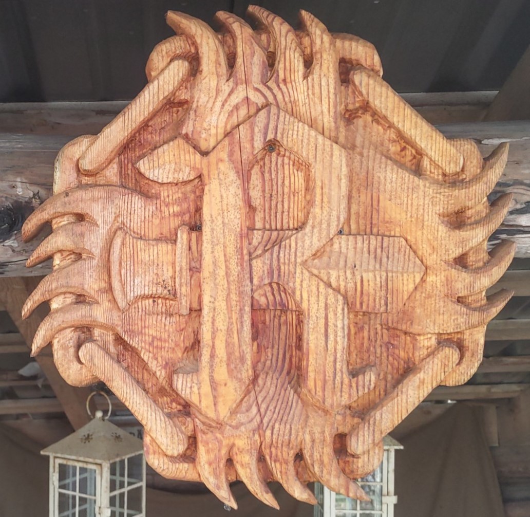 Moottorisahaveiston MMestari Hannu Kyllösen veistämä Rukajärven rintamatunnus. Lahja veteraani Tauno Tikkaselle hänen 100-vuotispäivänä 10.3.2016. Rukajärven kotiseutuneuvos Lauri Winbergin Kivivaaraksi 18.6.2009 vihkimän perinnepolun laavulla.